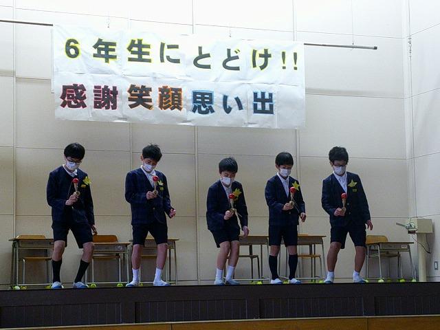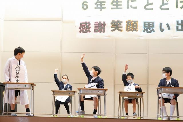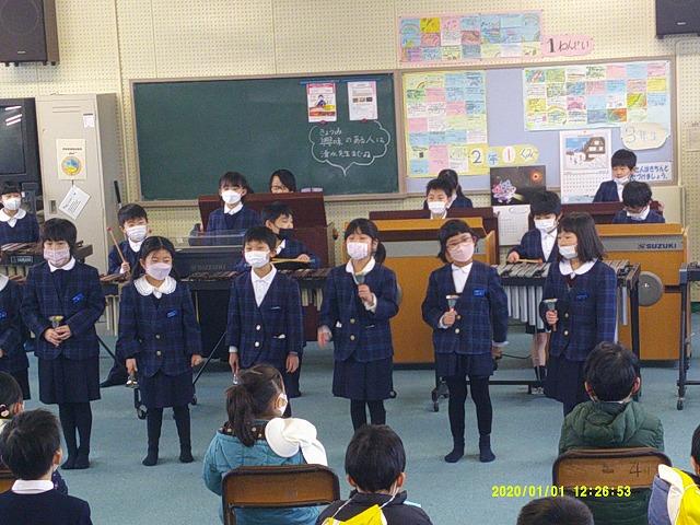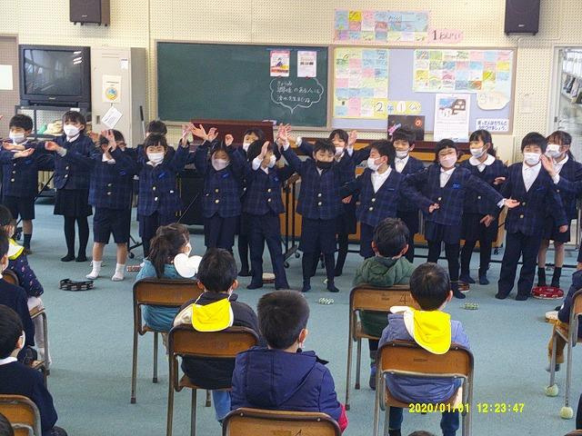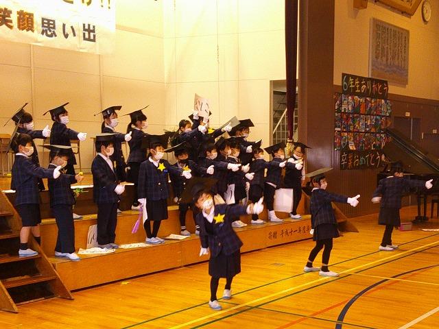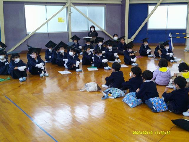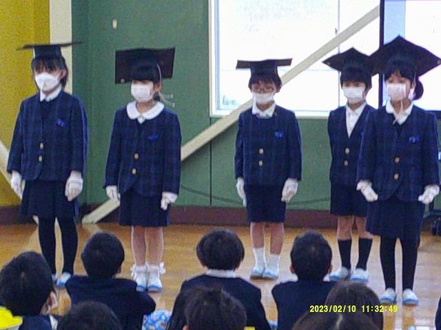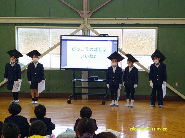 1年生は、博士帽子をかぶり、学校紹介のクイズや学校探検をしたり、歌や合奏のプレゼントを贈ったりと、4月の入学を楽しみにしてもらえるように頑張りました。年長さんの聞く姿勢がよいのに刺激を受けたのか、1年生は張り切って学校紹介をしていました。