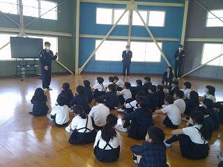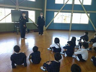 津幡警察署の方から安全な歩き方についてお話を聞きました。安全のポイントは「とまる」「みる」「まつ」の3つだそうです。