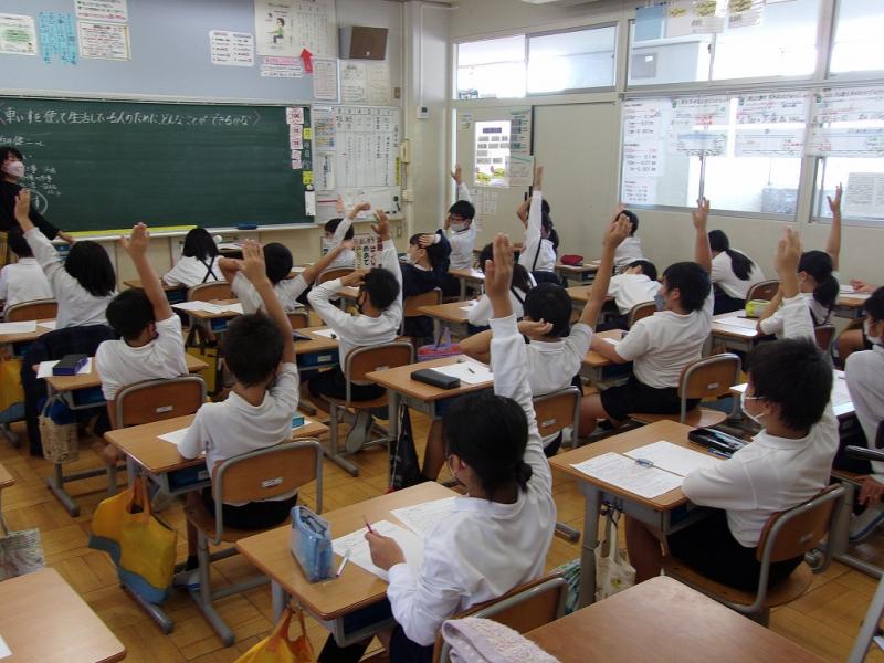 4年生は総合的な学習の時間に福祉に焦点を当てて学習を進めています。障害のある人や障害のある人をサポートしている人との出会いを通して、障害のある人の思いや願いを理解して、自分たちの町がだれにとっても暮らしやすい町になるように自分たちができることはないかを考えていく学習です。この日は、車いすを使って生活する人達がもっと暮らしやすくなるように自分はどんなことができるかを考えました。