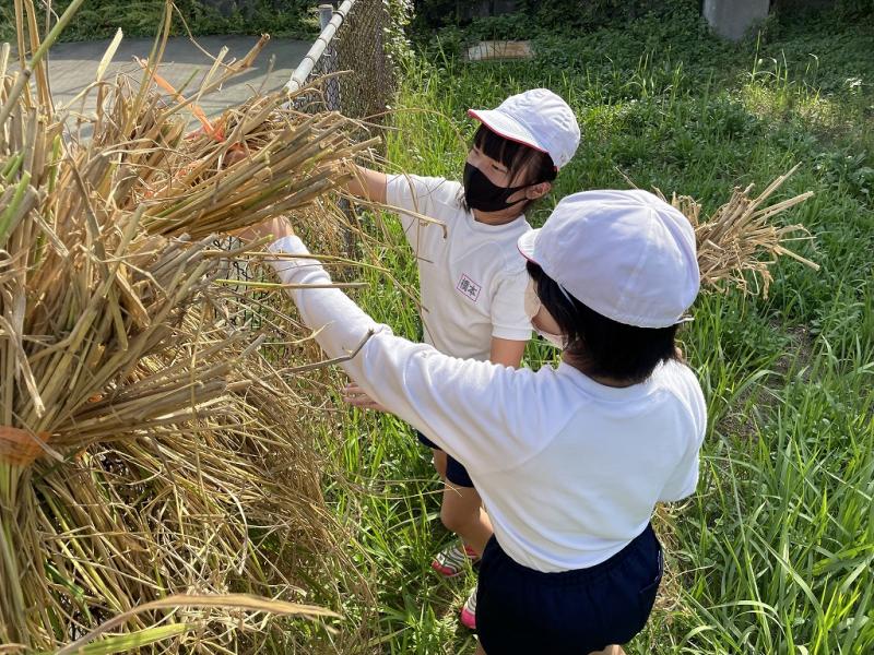 刈った稲は、束ねて干して脱穀の準備をしています。お米になるのが楽しみですね。