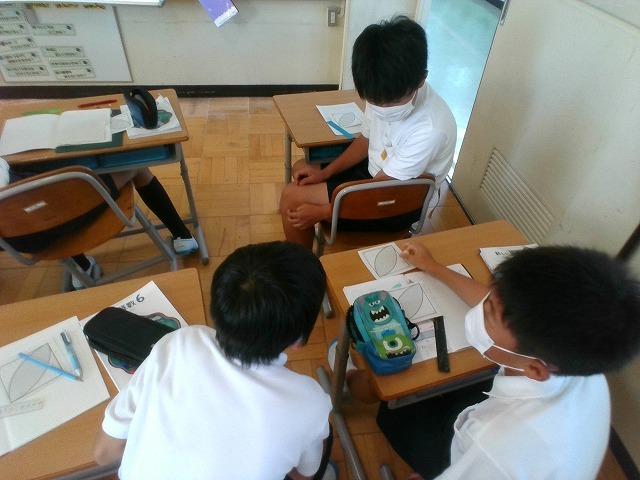 2限目に6年生の教室におじゃましました。2学期がスタートして1週間ほどですが、さすがは6年生。学びのモードになっていました。6年生は今、「円の面積の求め方を考えよう」という単元の学習をしています。この日は、正方形の中に円の1/4の図形を2つ書いてできるオムライス(目玉)のような形の面積の求め方を考える時間でした。子ども達は、既習の正方形や三角形、円の1/4の形をうまく使ってオムライス(目玉)の部分を求めようと一生懸命考えていました。近くの子にアドバイスを送ったり、全体の場で説明したり、いい姿がたくさん見られました。