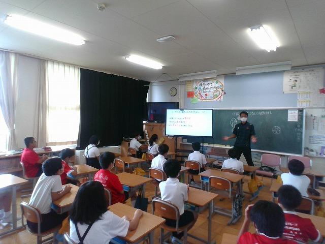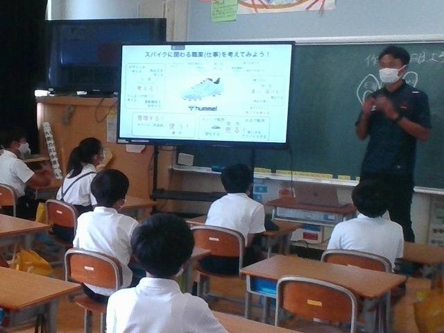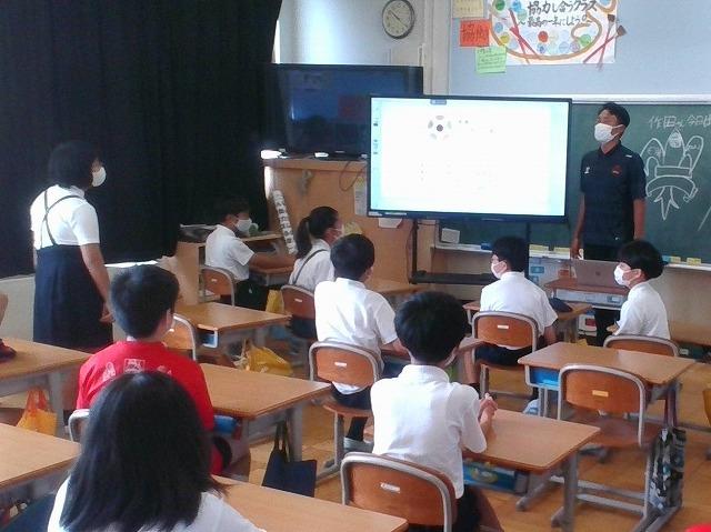 6年生の総合的な学習では、いろいろな人の生き方にふれ、自分の生き方に目を向け、自分の将来について考えていくことをねらって進めています。9月8日(木)2限目に、ツェーゲン金沢の作田裕次さんをお招きし、職業講和をしていただきました。作田さんは、昨年度まで選手としてツェーゲン金沢で活躍し、引退した後はU-18アカデミーで若手選手を育成する傍ら、クラブアンバサダーとしてツェーゲン金沢のPR活動をしているそうです。