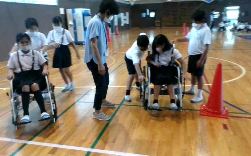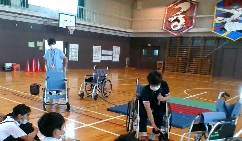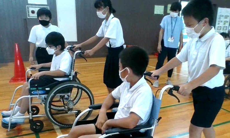 総合的な学習の時間のテーマ「人にやさしく」で福祉の学習をスタートさせた4年生。今日は、内灘町社会福祉協議会から講師をお招きし、車いす体験を行いました。車いすの仕組みについて学習した後、三人一組になり、「車いすに乗る人」「車いすを押す人」「見守る人」を交代で体験しました。車いすに乗っている人に対して「動きますよ」「止まりますよ」とやさしく声をかけること、乗り降りの時には必ずストッパーをかけること、ゆっくり動かすこと…車いすに乗っている人が安心できるような気配りがたくさんあることがわかった子ども達。今日の体験を生かしてこれから、「人にやさしい」町とはどんな町なのか、みんなで考えていきたいと思います。