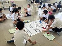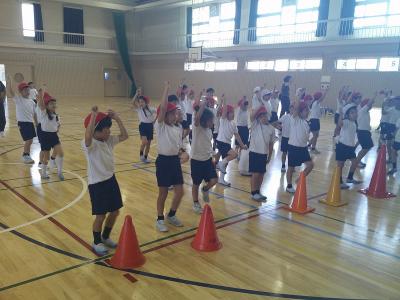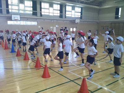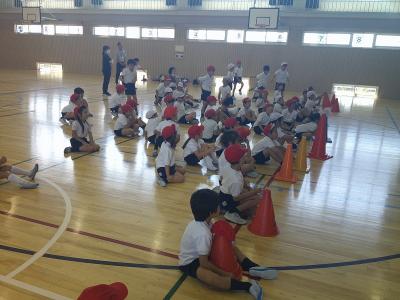 先生の説明を聞いてお手本を見ながら練習です。先生の動きを見ながら元気に体を動かしていました。