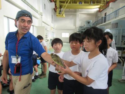 次に、河北潟の排水機の見学をし、河北潟の生き物とふれあいました。