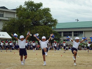 9月16日(土)心配していたお天気も、ちょうどよく過ごしやすい涼しさで、1年生にとっては、小学校はじめての運動会が行われました。本番まで、誰一人ダウンすることなく、元気に一生懸命、練習をすることができました。その成果があらわれ、どの子も立派な姿でがんばることができました。ダンスは指先までしっかり伸ばしてとてもかわいく踊ることができました。かけっこもみんな最後まで一生懸命走り切ることができました。玉入れ、縦割り競技、応援など力を合わせてがんばることができ、どの子も満足そうな表情でした。