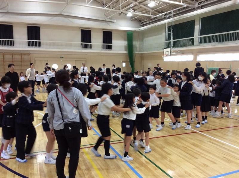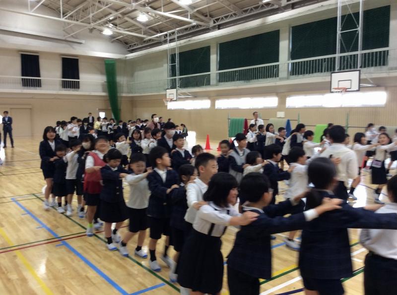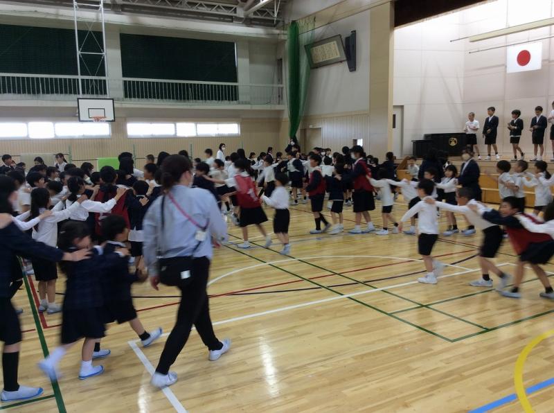 グループ発足のあと体育館に集まり、全校で「じゃんけん列車」をしました。
