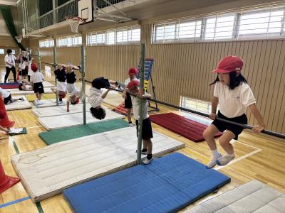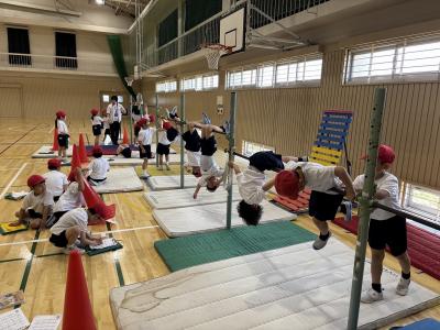 「ツバメ」や「ぶたまるやき」、「こうもり」など自分がやってみたい技を楽しんでいます。待っている間も友だちの応援をしていてとても微笑ましいです。