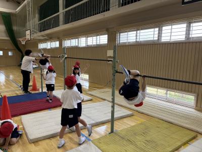 1年生は体育で鉄棒あそびをしています。