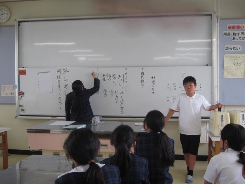 班のみんなと協力しながら一生懸命作っていました。包丁で食材を切ることや火を使って調理することは、この先きっと生活する中で役に立つことと思います。そして、作ったものをすべて残さずきれいに食べる姿が素敵でした。また、後片付けまでみんなで協力している様子もさすが高学年!