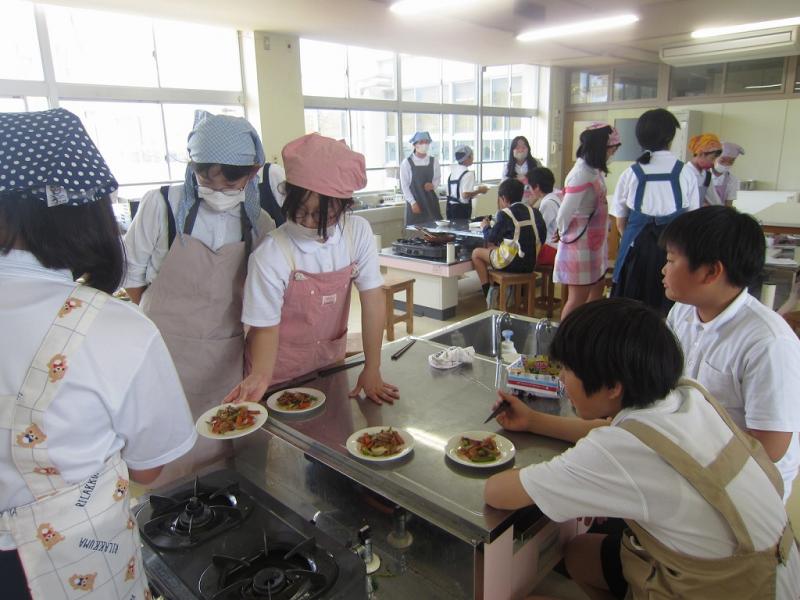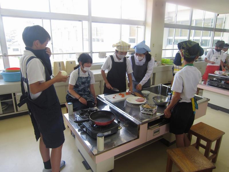 家庭科で、いためる料理を作る学習をしました。にんじん、ピーマン、玉ねぎ、ハムを使った「いろどりいため」です。