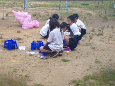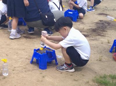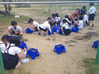 生活科の時間にあさがおのタネを植えました。1限目に植え方の勉強をして2限目に校庭で自分の鉢にタネを植えました。