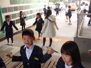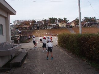 自分たちが体育館を使えないときは、渡り廊下のようなちょっとしたスペースを見つけてとんでいます。・・・体育の時間がいちばんゆったりとできるようです。