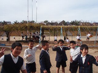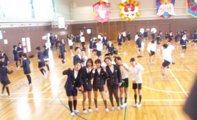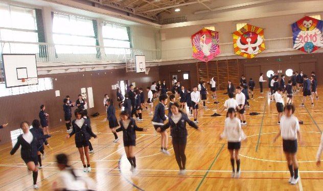 昼休みの様子です、元気いっぱい校庭のいたるところで外遊びをしています。それも厚着をするどころか、制服の上着を脱いで半袖で。体育館もたくさんの子どもが遊んでいます。なわとびに取り組む子もちらほらと。すばらしいことです。