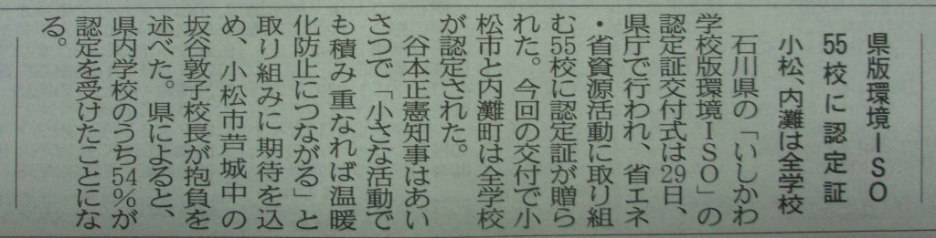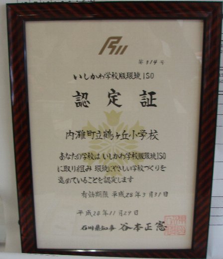 鶴ケ丘小で日常的に行われているエコ活動に子どもたちが懸命に取り組んでいることが認められ、11月29日(木)県庁で知事より認定書をいただきました。「内灘町エコスクール」「ユネスコスクール」に続いて3つ目の認定になります。2学期の終業式で子どもたちに伝えたいと思います。