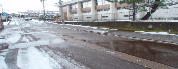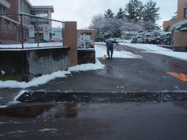 写真を見て下さい。早朝の鶴ケ丘小の校門です。みんなが登校する前に入り口の坂や近くの歩道につもった雪をすかして下さっている方がいます。