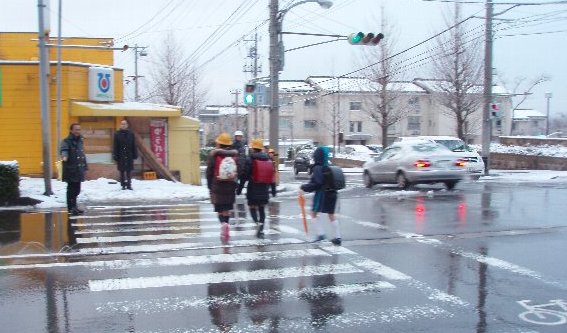 鶴ケ丘交差点では、交通安全推進隊の方に加え町長さんと津幡警察署長さんも登校を見守って下さいました。