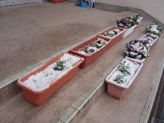 寒さの厳しいこの時期、花がなく寂しい思いをしています。児童玄関には葉ボタンが植えられています。そんな中、一昨日の夕刻内灘町のボランティアグループよりこの寒さの中でも花をつける草の苗をいただきました。さっそく園芸委員がプランターに植えてくれました。