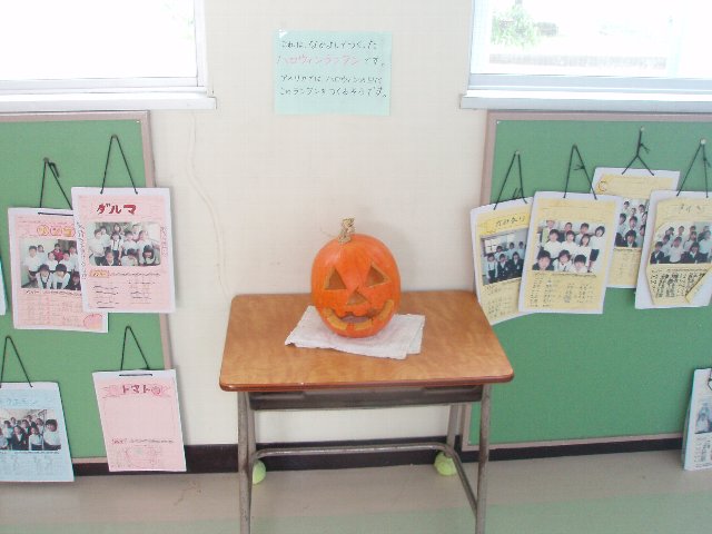 学校の畑で実ったお化けカボチャでつくったハロウィーンのかざりです。なかよし学級が作りました。上手ですね。