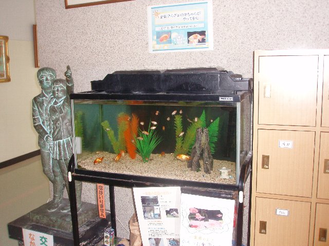 玄関の金魚・・・赤ちゃん金魚を大きな水そうに移しました。こんなに大きくなりました。持って帰って下さったお家でも元気に育っていますか。