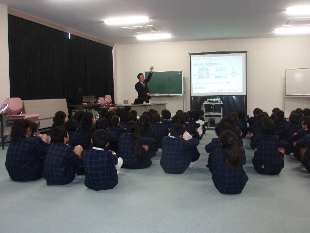 5年生 環境学習・・・国土交通省の方から地球温暖化と自動車の話を聞いています。
