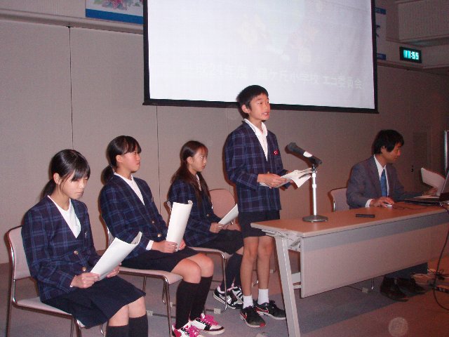 鶴ケ丘小の環境への取り組み、エコ活動を発表するために「エコ委員会」の代表4名が参加しました。5年くらい前にも発表させてもらいましたが、それからずっと継続し、中身も工夫し今日に至っていることが参加者に伝わったと思います。