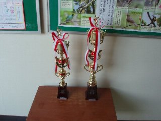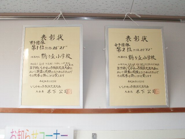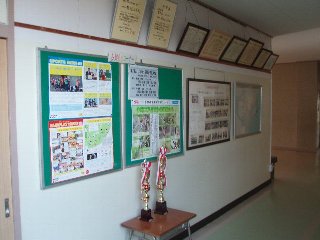学校1階廊下に団体男子1位と女子2位の賞状とトロフィーを飾りました。学校全体の子どもたちが誇りに思って毎日をがんばってくれるでしょう。