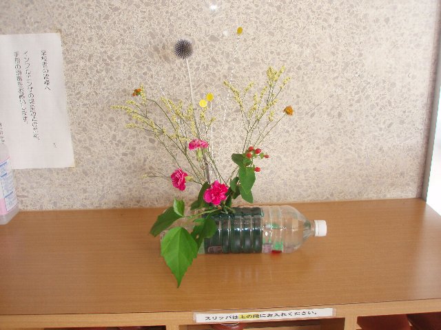 ペットボトルを器にして可憐に鶴ケ丘小に訪れる人をお出迎えしてくれています。日本伝統文化クラブの作品です。このクラブは毎回ちがった日本文化にふれています。前回はお茶でした。地域の先生、浅尾先生にご指導いただいています。