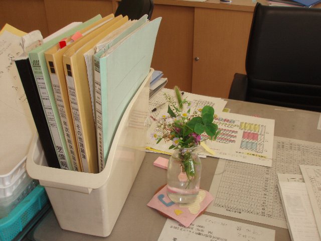 夏休みに入った日曜に学校へ遊びに来た2年生の女子が学校のまわりで花摘みをしてくれて休日に出勤していた職員に渡してくれました。器は牛乳瓶。