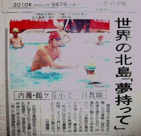 前回の北京オリンピック後休養を発表し、普通の暮らしに戻りました。きっと夢をかなえてしまったからでしょうか。しかし、オリンピックに挑戦することを決め練習を開始しました。鶴ケ丘小にやってきて子ども達に語ってくれたのはちょうどその頃でした。アメリカでの練習生活を開始し、「もう一度新たな夢に向かって挑戦を始めた」その気持ちを話してくれたのをおぼえています。でも、そのころは調子はいまひとつで、各種大会でも良い記録を残すことができず、オリンピックでの金メダルどころか出場すら危ぶまれていました。しかし、北島選手はその後新たな夢に向かって練習を重ね、今年の春に見事三度目のオリンピック日本代表に選ばれました。しかも100mは日本新記録での代表でした。