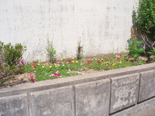 校庭の草木も水をほしがって悲鳴を上げています。その中で、校門の花壇の花はいつも元気いっぱいです。というのは、以前このページに載せましたが近所の方で校門前庭を気にかけてお世話下さっている方がおいでます。あの頃は誰が?とわからなかったのですがかぐ真向かいの家の方が早朝草むしりだけでなく水やりなどをして下さっています。先日は、背の高い花に添え木までして下さいました。 本当にありがとうございます。