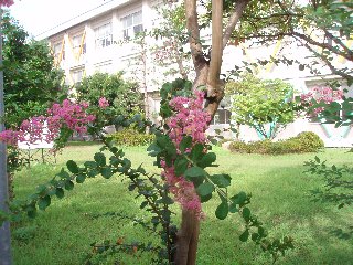 草木は生き返り、池の魚や亀は喜んでいると思います。校舎を一回りしたとき、「サルスベリ」の木がきれいな花をつけているのに気がつきました。鶴ケ丘小はほんとうにいろいろな木に囲まれていて四季折々の花が季節を感じさせてくれます。次は・・・・どの花が咲くのかな。
