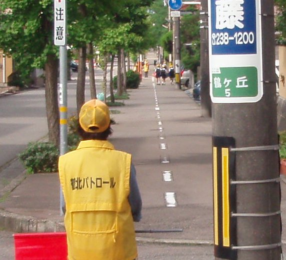 その中で鶴ケ丘安全パトロール隊が毎朝・毎下校時に通学路の各交差点に立って下さり子どもたちの安全を見守って下さっています。鶴ケ丘の町会は碁盤の目状で見通しが良く、写真のように1km先までパトロール隊が辻々に安全指導をして下さっている姿を見ることができます。