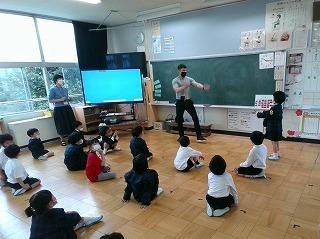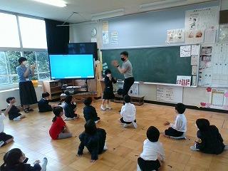 1年生は、年間10回程度ケリンバウリング先生と一緒に英語活動をします。1回目のこの日は、名前のキャッチボールをしていました。ケリン先生が「My name is~ケリン.」 と言った後ボールを投げると、前に出た子はボールをキャッチします。そして今度は自分が「My name is~.」と言った後ボールをケリン先生に返していました。