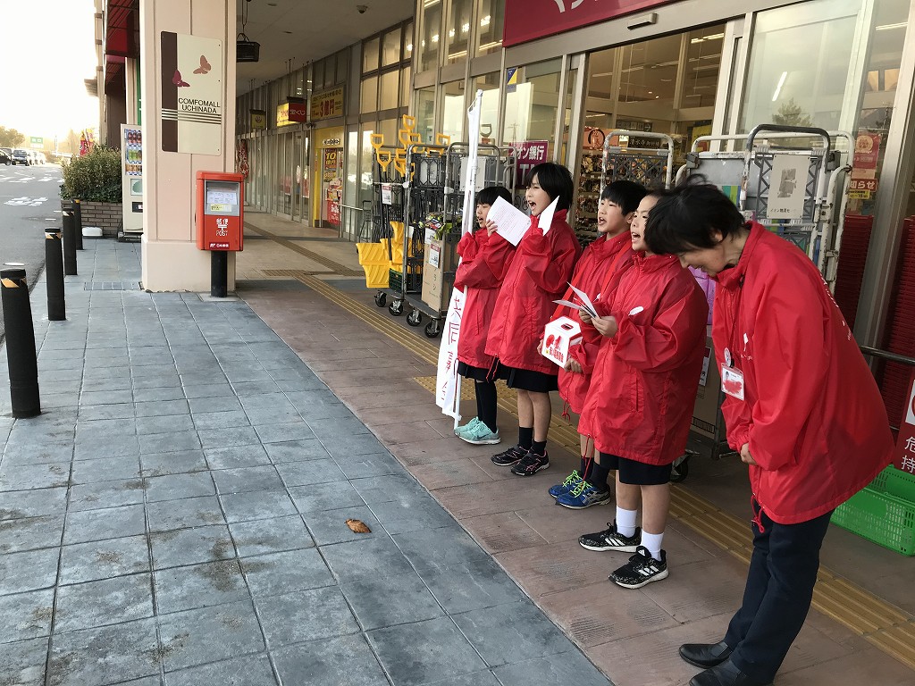 今日の委員会活動では、運営委員会の5・6年生がコンフォモール内灘のマックスバリュー前で、赤い羽根共同募金の募金活動を行いました。