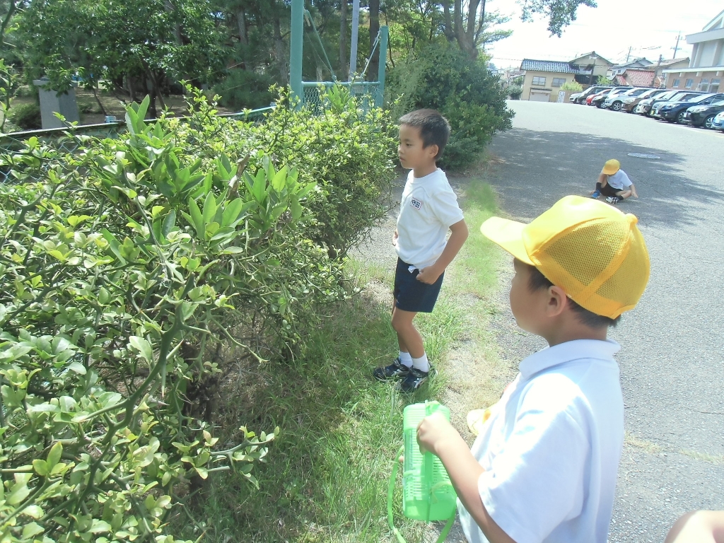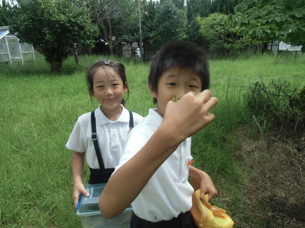 生活科の学習で秋の虫探しをしています。「夏の虫と比べて成長していて体が大きくなってる、色がかわっている」と変化に気付いている子どもたちです。上手にさっと見つけてつかまえる子、なかなかうまくつかまえることができない子など様々ですが、みんなとても楽しそうに虫を探しています。「はじめて、つかまえられたよ。」とうれしそうに話してくれる子や「見て!」とつかまえた虫を見せに来てくれる子もいます。休み時間も虫かごをもって出かけていく虫に夢中な子どもたちです。