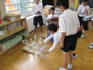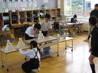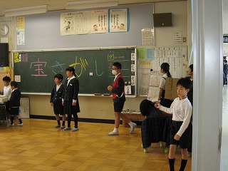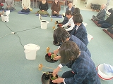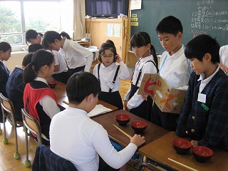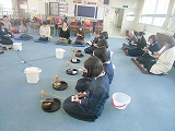 子どもたちは、自在庵(お茶室)での体感もして、お抹茶をたてるのがもとても上手になってきました。そこで、今回は、保護者の方や図書ボランテイアの方、見守り隊の方をご招待し、感謝の気持ちをこめて、お抹茶をたてました。いつもより少し緊張気味の様子でしたが、「おいしい」と言っていただき、うれしそうでした。おもてなしの心も経験することができ、よいひと時を過ごすことができました。