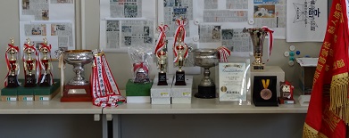 令和元年度の石川県高等学校新人大会を終えて、職員室には優勝旗やトロフィーが並びました。