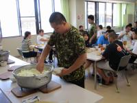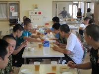 この日の朝昼食は柔道部OBの割烹たけし店主、桂木さん、4月からそこで働く野球部OBの油井さんが準備してくれました。朝から店で仕込みをし、学校の厨房で仕上げます。大会にむけ「相手をカモにする」鴨どんぶりを振る舞っていただきました。