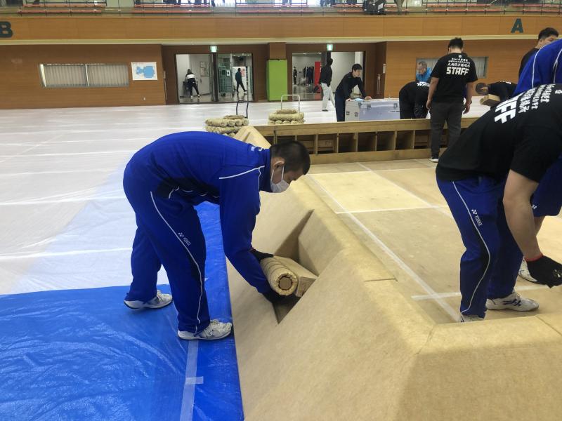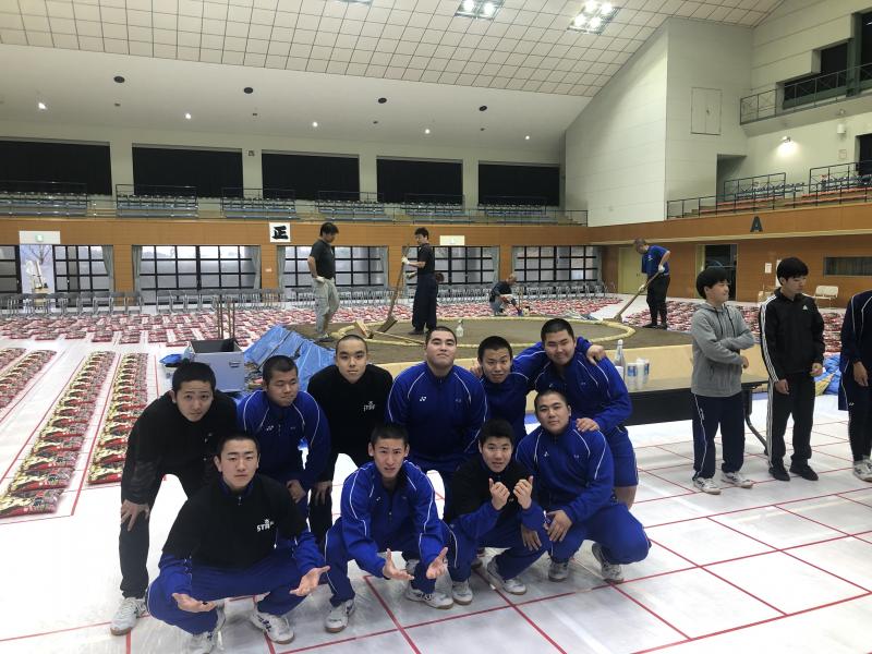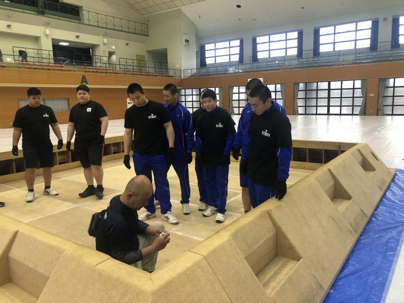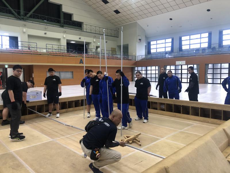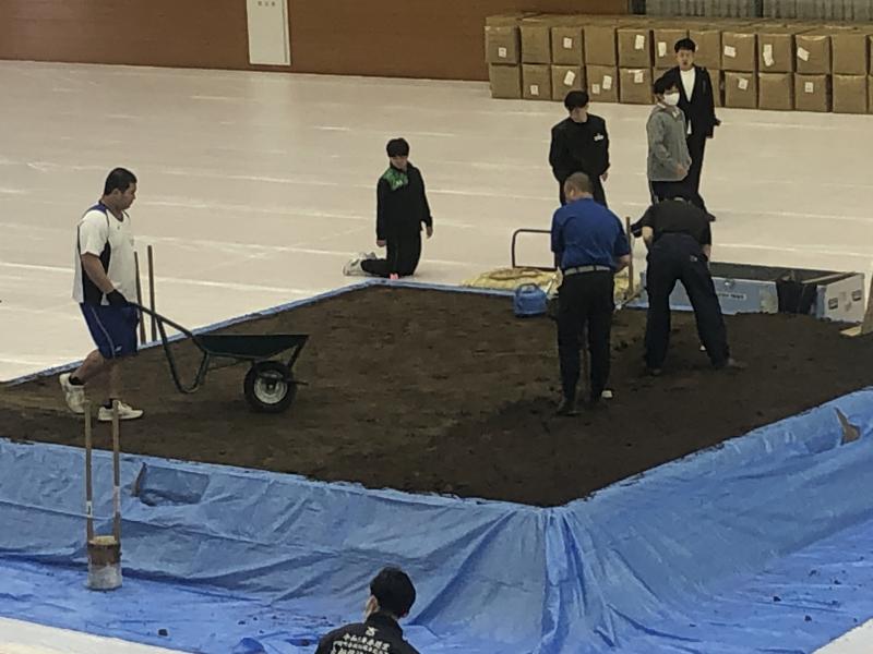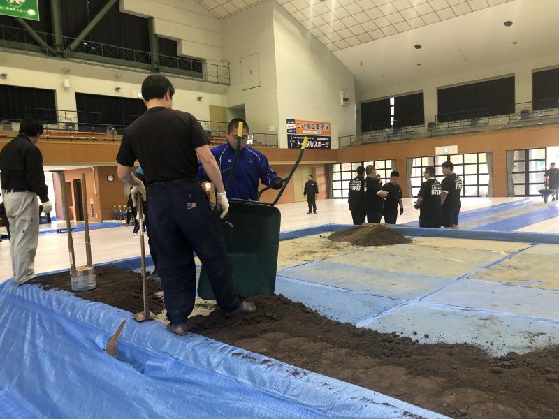体育館に土俵の枠を設置し、その後土を運んで土俵をつくりました。