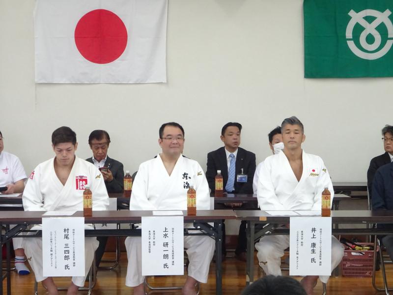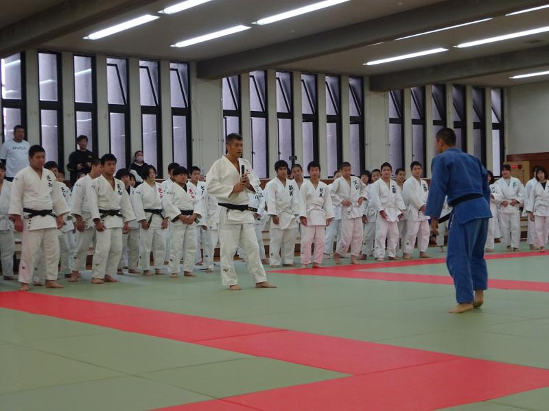 東海大学より上水研一朗j男子柔道部監督、井上康生柔道部副部長、パリオリンピック90㎏級の銀メダリスト村尾三四郎選手をお招きして、午前中に中学生、午後より小学生を対象に開催されました。