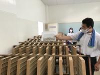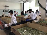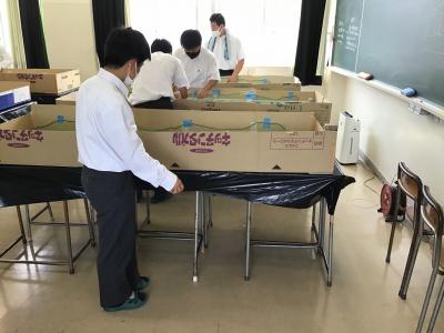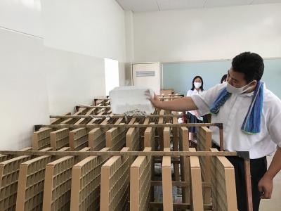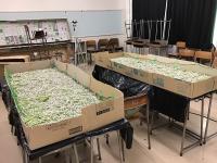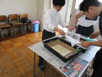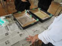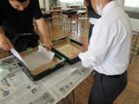 ●届いた蚕を養蚕部の池田君(3年)と顧問の大丸先生で箱から当面のすみかに丁寧に移します。蚕の成長とともにすみかも大きくなっていきます。