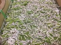 ●収穫した桑の葉を水で丁寧に洗い、細かく切って2mmほどの蚕の幼虫に与えます。蚕が成長してくると、この切る作業はなくなります。