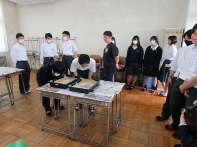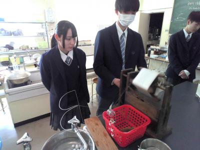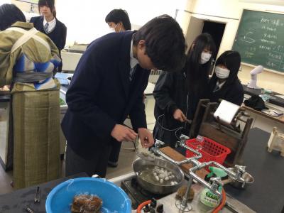 本校では今年度も約400頭の蚕を飼育し、繭を採取しました。これまで生徒は、これらの繭を使って簡単な製糸の実験を行ってきましたが、今回は江戸時代から使われてきたとされる「座繰り器」を実際に使用し、本格的な製糸を体験しました。