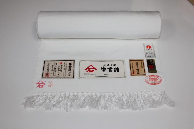 生徒が育てた蚕『玉小石』の繭で制作した「牛首紬」(左:白生地、右:白生地 帯)