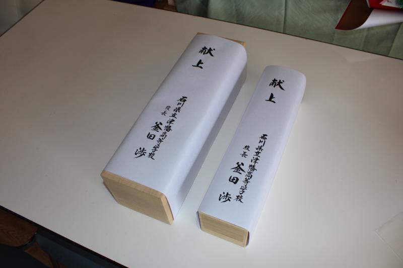 本校は創立100周年記念事業の「養蚕復活プロジェクト」で、津幡高校産の繭「玉小石」で制作した「牛首紬」(白生地一反・白生地帯一本)を、上皇后陛下への献上品として宮内庁に送付しました。