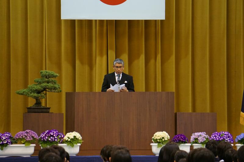 式辞を述べる釜田渉校長 祝辞を述べる津幡町長矢田富郎様
