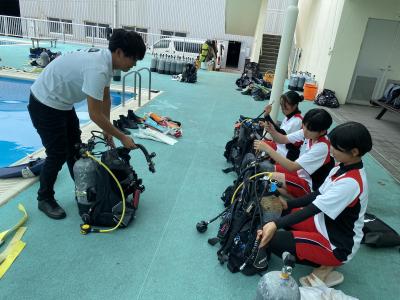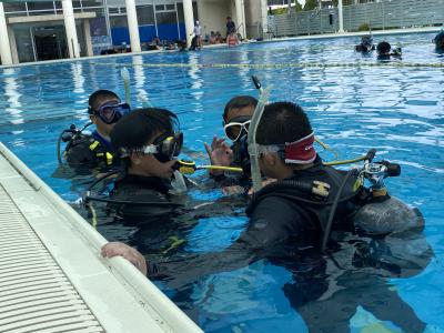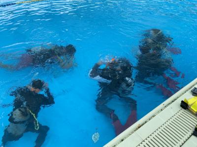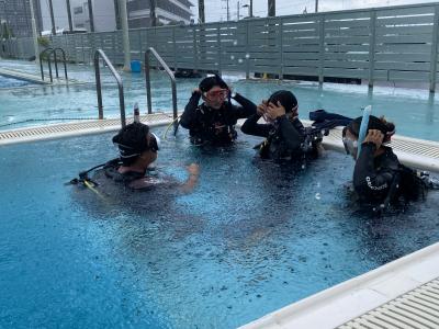 今日はプールでの実習です。一つひとつステップアップし、徐々に水に潜り始めました。