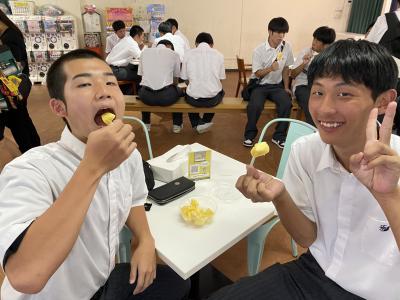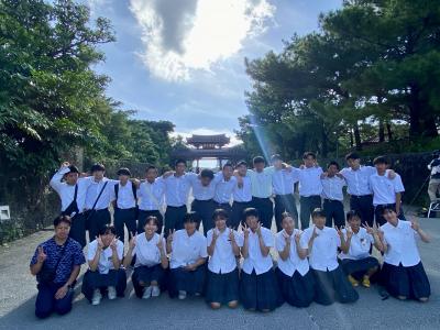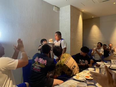 金城先生が三線を演奏し、柔道部の2人が一曲ずつ歌い、スポ科全員で祝福しました。