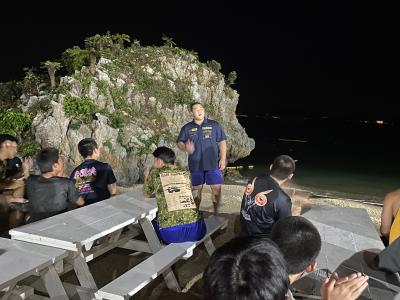 朝の体操と軽い運動からスタートです!今日は海での実習です!緊張とワクワクが入り混じっている様子です。